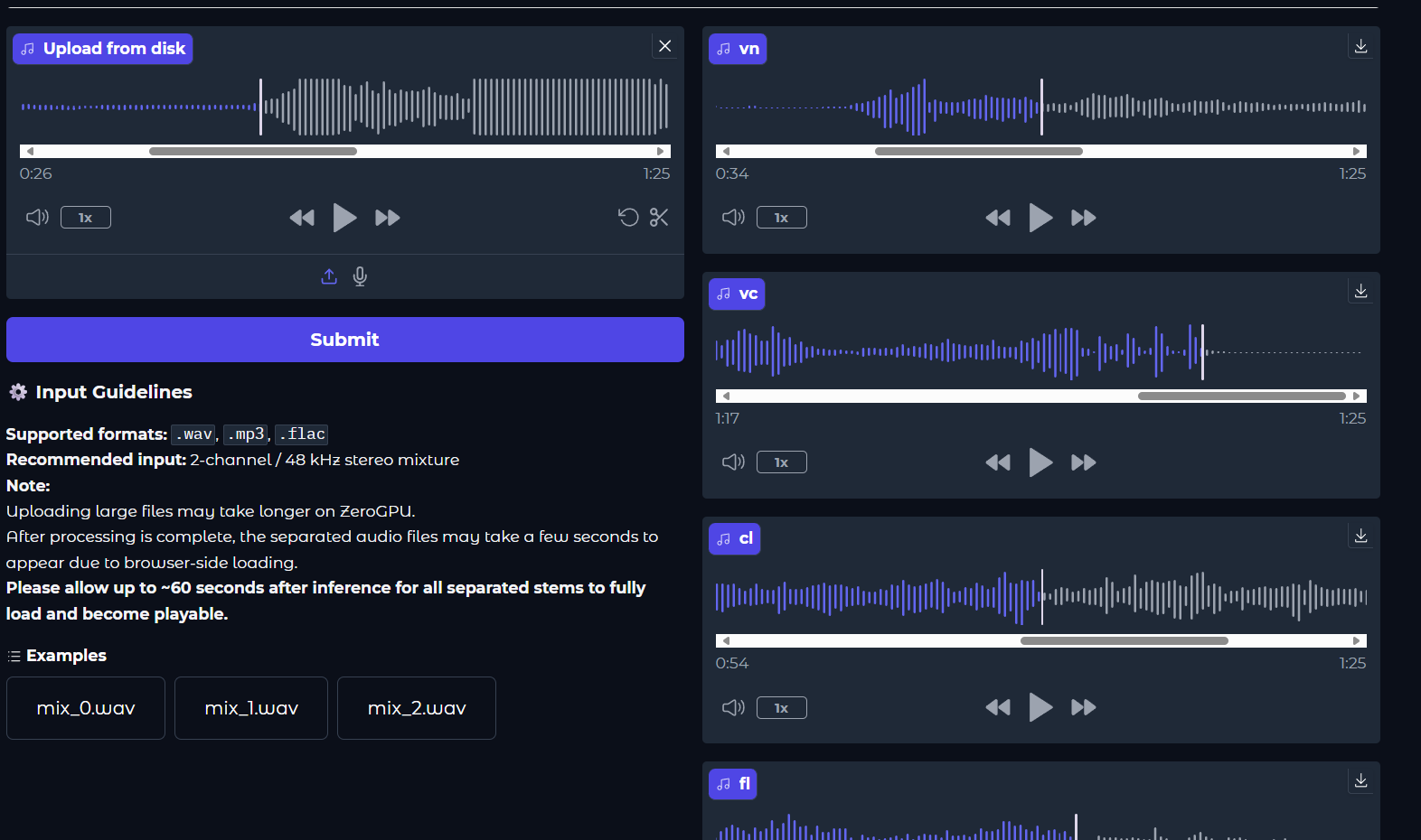此系統已於 Hugging Face Spaces 平台上提供互動式展示與實證:Symphonia — Near Real-Time Orchestral Music Source Separation(https://huggingface.co/spaces/YWYG/symphonia)。使用者可即時上傳音訊片段,體驗八軌分離、音源可視化與多樂器輸出結果,展示本系統在古典音樂場景中的實際效能與應用潛力。