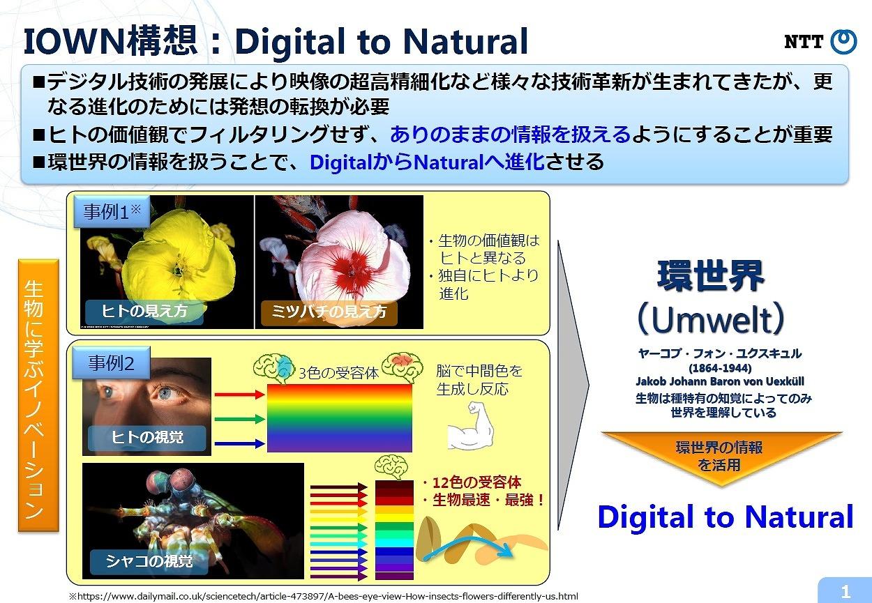 這意味著:「觀察的主體不同,對世界的理解與資訊處理方式也不同。」IOWN 構想正是基於這樣的理念,主張要利用數位技術,建構出能夠對應多種「環世界」的資訊基礎,追求讓人們以感受不到壓力、能自然地享受的放鬆狀態(Natural)。