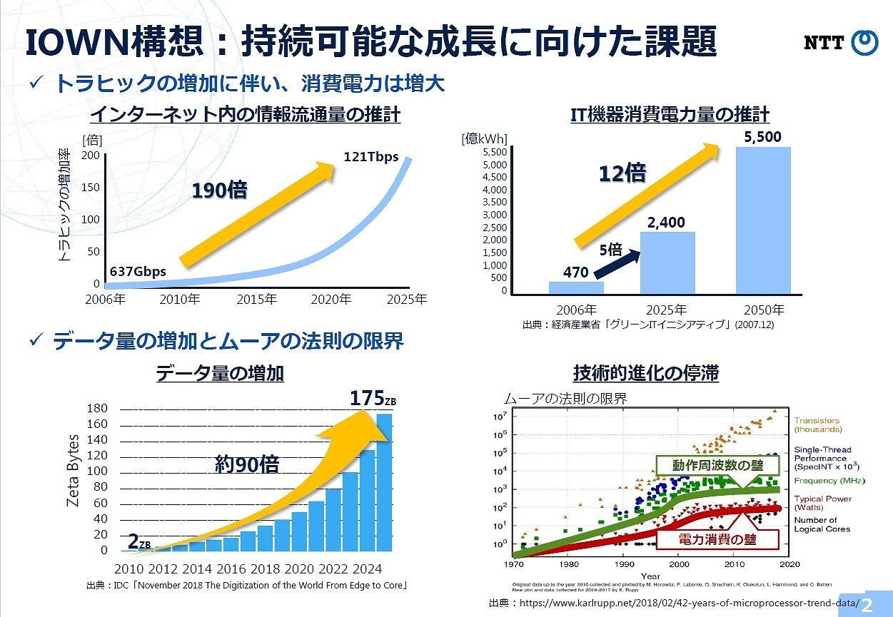 事實上,半導體的集積率早在2010年前後就已達到高峰。如今,由於受限於運作頻率與耗電量之間的瓶頸,要再提升集積率已變得極為困難。IOWN構想所追求的目標,是要建立一個能支撐前所未有龐大資訊處理量的創新資訊處理基礎,藉此突破現有技術的極限,特別是耗電量的限制,帶來一場徹底的技術變革。