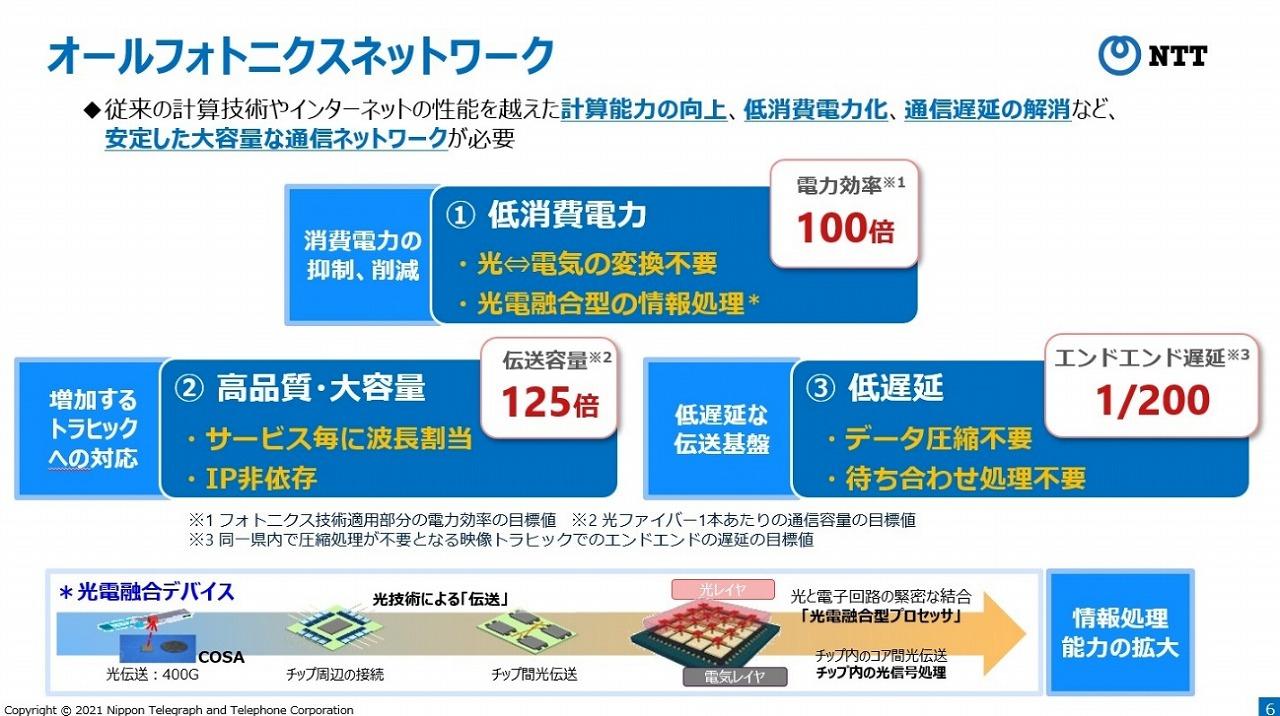 由此可見,全光網路(All-Photonics Network)是促進資訊處理平台潛力大幅提升的重要技術。根據NTT目前的目標,預計將來能實現: