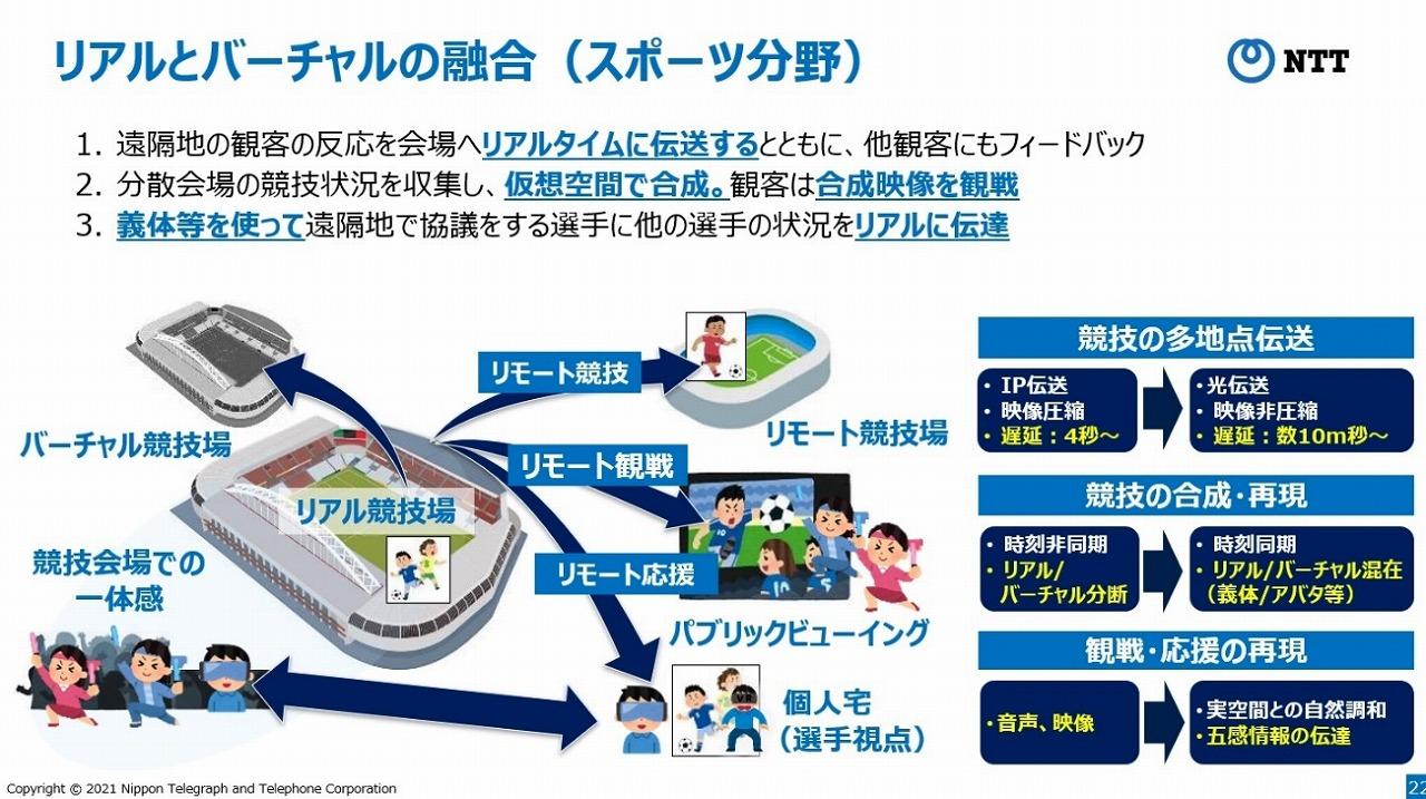 此外,在運動賽事領域,IOWN構想也旨在推動「虛實整合」。具體而言,包括將遠端觀眾的反應即時傳送至現場會場,並同時將這些反應回饋給其他觀眾,創造更加沉浸式、互動性的觀賽體驗。