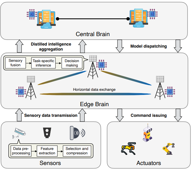中央大腦位於雲端資料中心,擁有強大的運算和儲存能力,主要負責處理運算密集但時間容忍度較高的任務,如大規模模型訓練、長期趨勢分析、全域最優化決策等。執行器則作為系統與物理世界的介面,接收來自邊緣大腦的即時指令,執行具體的物理動作或控制操作。