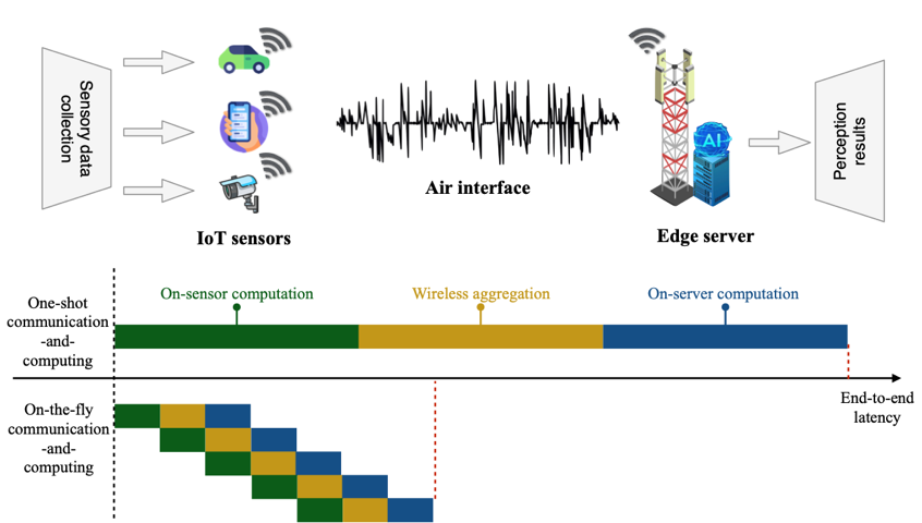 如圖6所示的AirComp技術利用無線通道的波形疊加特性實現分散式運算突破,多個邊緣設備同時傳輸資料,這些訊號在無線通道中自然疊加,接收端可以直接從疊加訊號中提取聚合運算結果,這種方法的最大優勢在於運算延遲與參與設備數量無關,能夠實現真正的大規模即時協同運算。