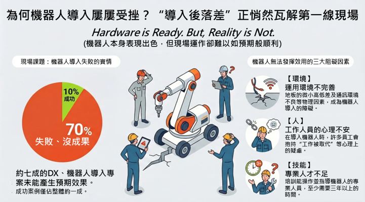 儘管自動化需求高漲,但現實卻充滿挑戰。「硬體已就緒,但現場環境尚未跟上(Hardware is Ready. But, Reality is Not.)」這句標語精準點出了問題核心。根據統計,約有七成的數位轉型(DX)與機器人導入專案未能達到預期效果,成功案例僅佔一成。