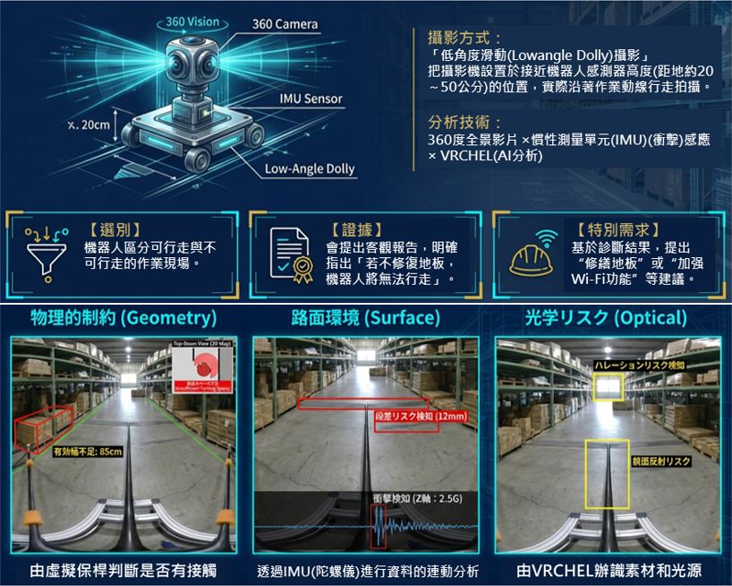為了確保導入成功,JG Robot Ready首先透過搭載360度攝影機與LiDAR的掃描設備進行環境診斷。其核心技術在於「低角度滑動(Low-angle Dolly)攝影」,將鏡頭設置於距地約20至50公分的機器人視角,沿著實際作業動線進行拍攝。