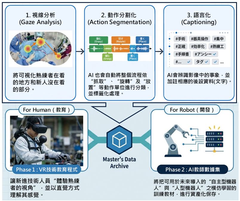 透過視線分析(Gaze Analysis)與動作分割化(Action Segmentation)技術,系統能記錄熟練工的視線焦點與身體動作,並將其轉化為AI可解析的數據 。這些數據具有雙重價值: