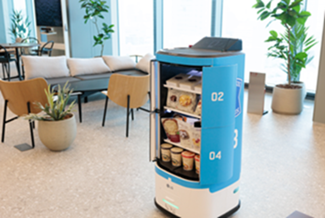 上班族只要在手機App下單,商品就會由配送機器人送到面前。App也能查看機器人的位置與庫存,讓使用者找到最近的機器人領取商品,並完成付款。