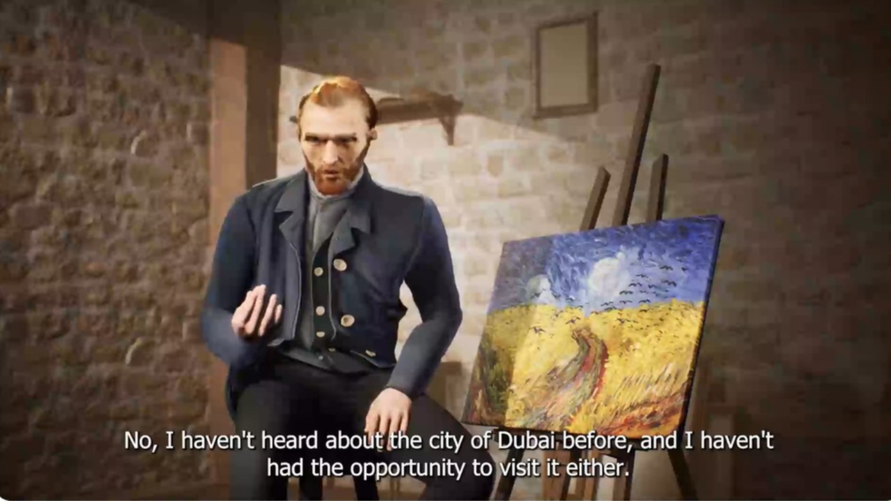 近年來AI(Artificial Intelligence)人工智慧的蓬勃發展在博物館與美術館的展示應用創造許多創新互動的潛力。例如:法國 奧賽美術館(Musée d'Orsay)運用AI人工智慧的演算法解析梵谷早期的傳記與書信,深入瞭解他的思想與創作過程,進而打造「梵谷AI虛擬導覽員」讓世界各地的觀眾能與梵谷對話,如下圖1所示。