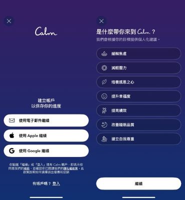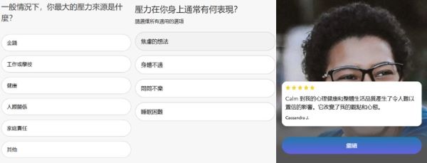 (1)使用者登入/建立帳號,並選擇來到Calm的原因。