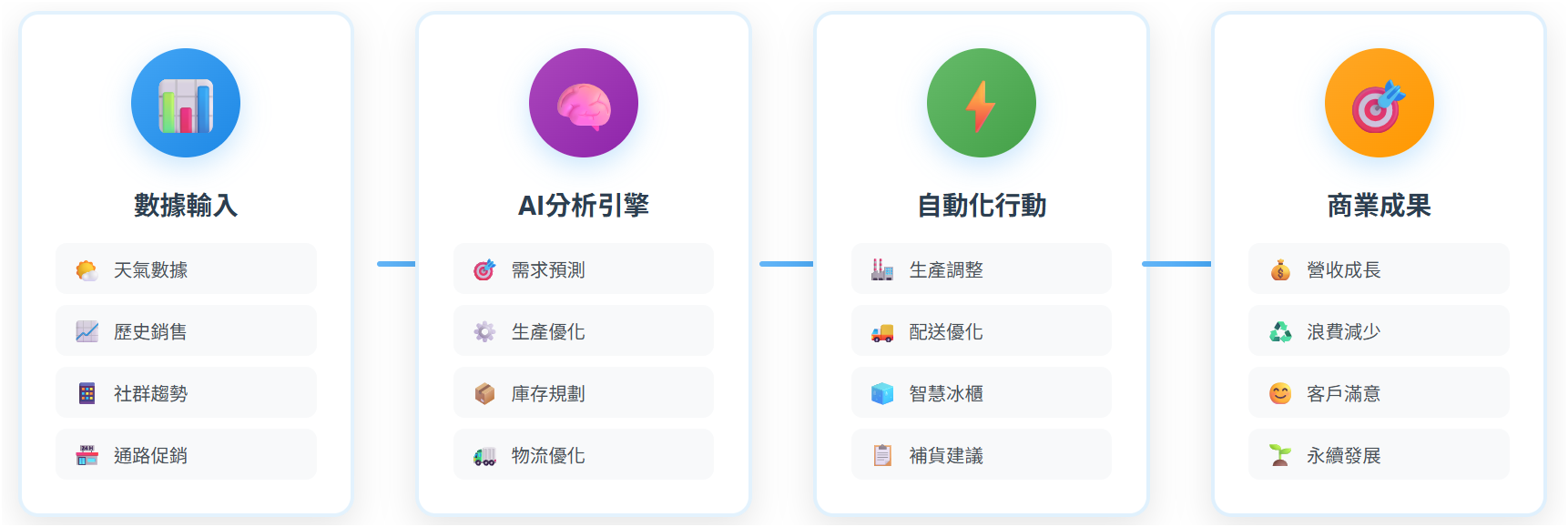 | 2020年後 | 供應鏈AI應用擴大 擴大AI在供應鏈管理、需求預測、庫存優化與物流規劃的應用 | 橫向拓展至多元場景,供應鏈效率顯著提升,為冰淇淋業務AI化做準備 |