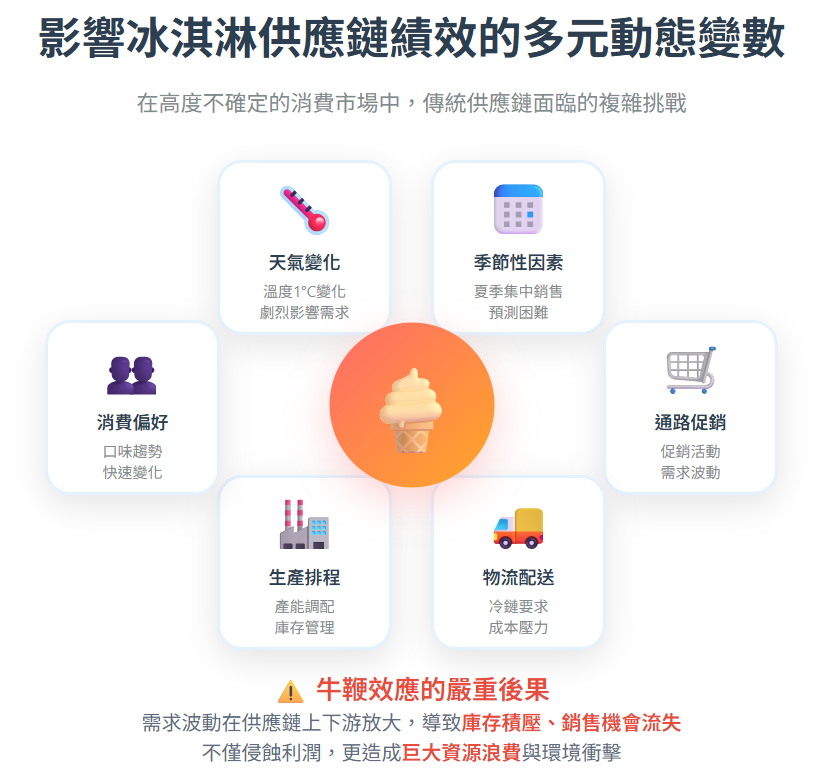 快速消費品產業的本質,在於應對由消費者偏好、季節性因素、通路促銷與宏觀經濟等無數變數所構成的複雜需求網絡。對聯合利華的冰淇淋業務而言,此挑戰尤為嚴峻——天氣,成為影響營收最直接、也最不可控的關鍵變數。在歐洲市場,夏季月份僅僅 1°C 的溫度變化,就足以引發需求預測的劇烈震盪。在傳統模式下,這種波動往往導致「牛鞭效應」,造成供應鏈上下游的庫存積壓或銷售機會流失,不僅侵蝕利潤,更衍生出巨大的資源浪費。