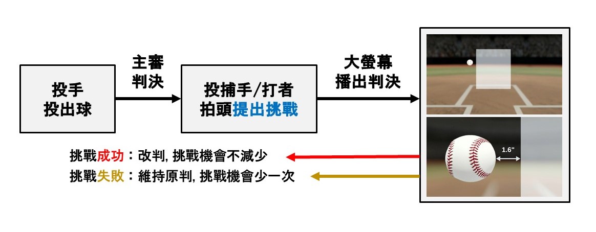 1. 挑戰制度(Challenge):由主審進行傳統好壞球判決,球員若有異議可即時拍點帽子或頭盔與主審表示進行「挑戰」(每隊每場限兩次,成功不扣次數)。