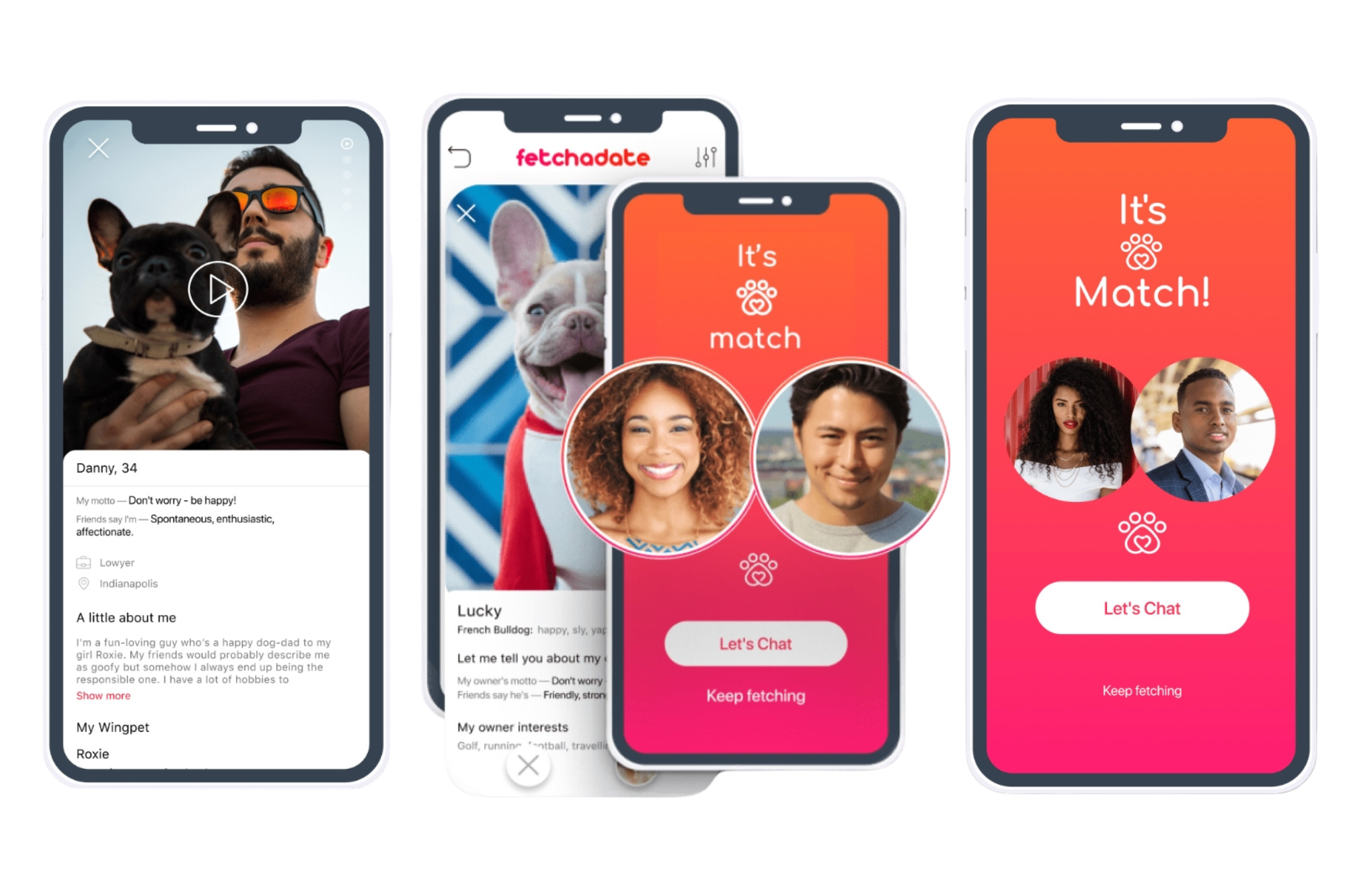 FetchaDate 由前記者、認證訓犬師與兩性顧問Sheryl Matthys 創立。她因飼養靈提犬發現寵物能成為人際互動的橋樑,進而舉辦單身狗派對並經營社群,累積愛寵族群人脈。平台於2021 年2 月14 日上線,註冊於美國印第安納州。「FetchaDate」名稱結合「fetch(擲接遊戲)」與「date(約會)」,傳達以寵物牽起人際連結的理念。