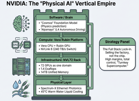 - Alpamayo 自駕平台: 開源 L4 級自駕技術,意在讓所有車廠都依賴 NVIDIA 的模擬與訓練生態,將實體世界的數據霸權握在手中。