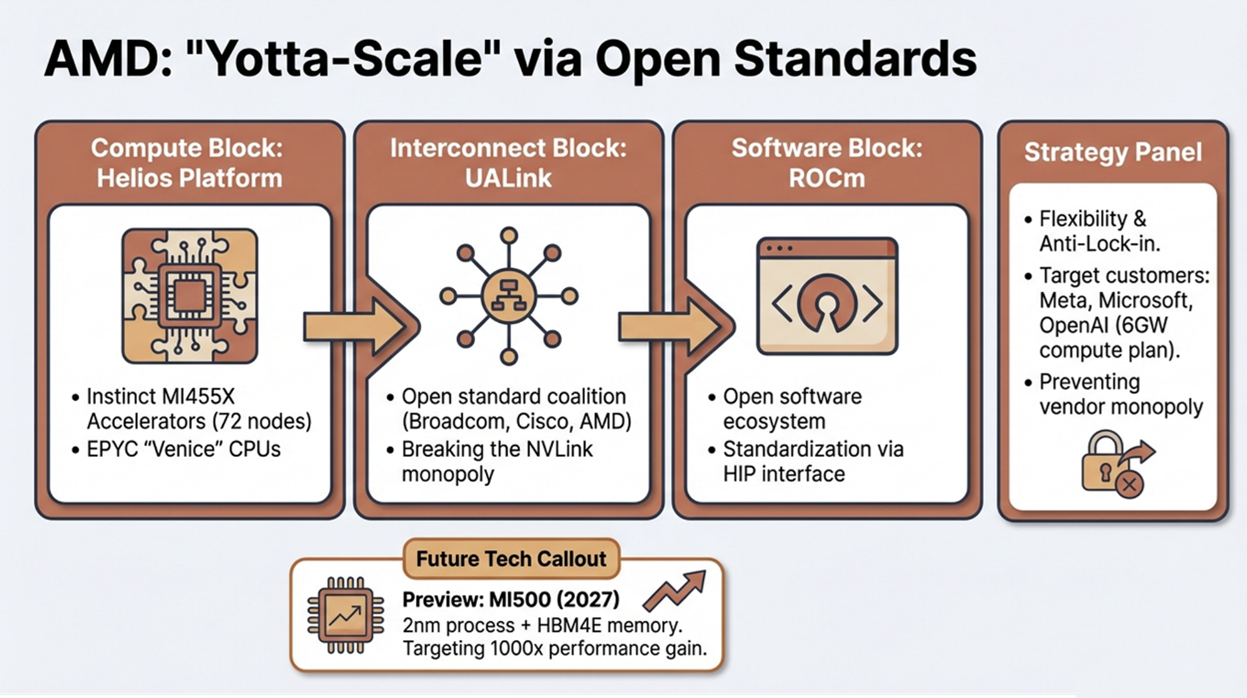 AMD 的策略是「性價比與彈性」。對於不想被 NVIDIA 全家桶綁架的客戶(如 Microsoft, Meta, OpenAI),AMD 提供了唯一的替代方案。特別是與 OpenAI 的深度合作(計畫部署6GW算力),證明了AMD在超大規模訓練上已具備實戰能力。