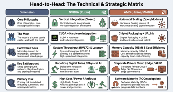 2026 年後,AI 晶片產業正式邁入雙軌競爭新階段,NVIDIA 與 AMD 兩大陣營分別以「封閉整合」與「開放聯盟」為核心戰略,形塑出截然不同的生態藍圖。NVIDIA 透過 Vera Rubin 平台強化從硬體到軟體的垂直整合,聚焦於實體自動化與基礎設施主導;而 AMD 則以 Instinct MI 系列與 ROCm 平台為基礎,結合開放標準與高性價比訴求,加速滲透邊緣與私有雲市場。以下對照表即總結兩者在戰略重心、技術焦點與市場布局上的關鍵差異。