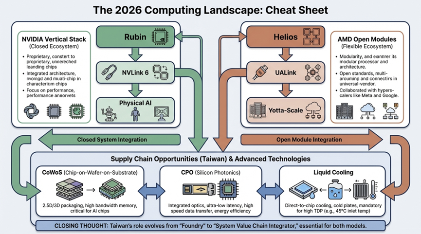 2026年CES展所揭示的「雙雄對決」,對台灣而言,不再僅是晶片訂單的爭奪戰,而是一場「系統級價值鏈(System-Level Value Chain)」的重分配。隨著 NVIDIA 走向封閉式的全端系統、AMD擁抱開放標準,台灣供應鏈將被迫(也同時受惠)進行更細緻的分工與升級。