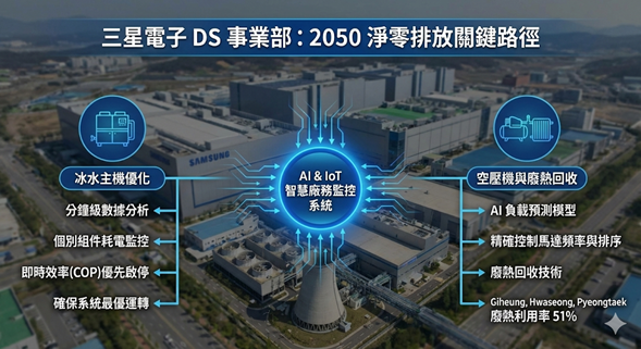 三星電子(Samsung Electronics)在DS半導體事業暨裝置解決方案事業部中,將AI與IoT技術視為達成2050淨零排放目標的關鍵路徑,在韓國多個廠區內大規模導入智慧廠務監控系統,自主開發AI自動化控制系統,能針對冰水主機進行分鐘級的數據分析,不僅監控個別組件的耗電量,更能依即時使用效率而非設備運轉時間來決定設備啟停排序,確保系統始終優先啟用性能係數(COP)最優的設備。導入AI負載預測模型以精確控制空壓機馬達頻率與啟動排序,結合廢熱回收技術,使Giheung、Hwaseong與 Pyeongtaek三個廠區的廢熱利用率攀升至51%。