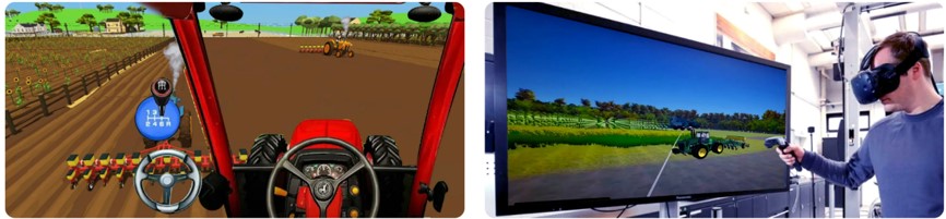 受訓者戴上 VR 頭戴裝置後進入虛擬農田場景,學習如何駕駛自走式拖拉機、播種機或收割機,體驗操作介面與工作流程。在頭戴裝置中會模擬實際操作畫面與反應,包含啟動、轉彎、施作等細節,並透過回饋系統修正錯誤操作。