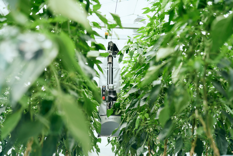 位於宮崎縣的新富町,AGRIST與當地農戶合作,研發出一款名為「L」的自動採收機器人。這款16公斤重的機器人可在單次充電後持續作業四小時,最大特點是其「架空式」的移動方式:機器人懸掛於溫室上方的鋼索軌道上運行,與地面型農業機器人相比,能有效避開地面障礙物如泥濘、葉片或根莖,提升採收效率與作業穩定性。L型機器人能精準判別甜椒成熟度,以約28秒的速度完成一次採摘作業,並可實現180度方向的剪切動作,具備相當高的機動性。