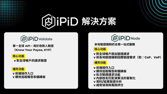 iPiD 的技術核心是其跨國驗證網絡,與全球多家銀行、即時支付系統與合規資料來源建立安全連線,當支付業者向 iPiD 傳送收款人資訊(姓名、帳號、手機號碼等)時,平台可即時查核帳戶是否存在、是否屬於指定收款人以及是否符合當地格式與規範。透過此網絡,跨境驗證不再依賴逐一洽談與客製化串接,而能以統一標準進行。