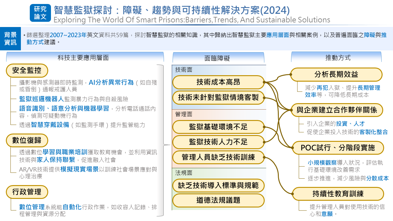 本研究研析由印尼主導、英國研究者共同參與的跨國合作文獻-智慧監獄探討:障礙、趨勢與可持續性解決方案(如2024)探討智慧監獄的相關知識,其中歸納出智慧監獄主要應用層面與相關案例,以及普遍面臨之障礙與推動方式建議,提供矯正機關或對智慧監獄有興趣者參考。