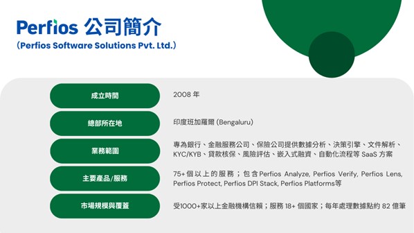 總部位於印度班加羅爾的金融科技公司Perfios,自2008年成立以來,以「促進金融普惠、使金融服務觸及更廣泛族群」為使命,運用AI/ML、巨量資料分析與文件數位化技術,協助銀行、保險業者、FinTech、支付機構與電商平台等多元場景,優化從新戶審核、文件分析、信用評估到貸後管理的完整流程。