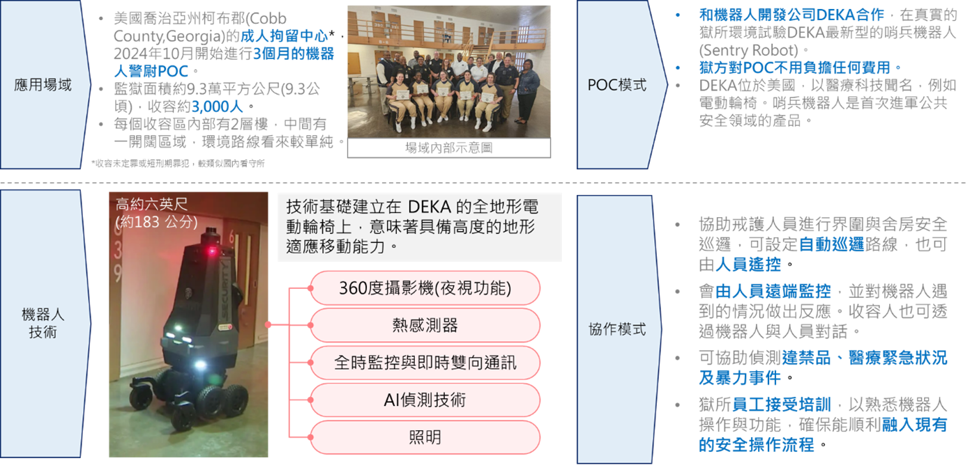 美國喬治亞州科布郡成人拘留中心於2024年10月啟動為期3個月的機器人巡邏警衛POC,試行之場域規模相當大,面積9.3萬平方公尺、約3,000名收容人。
