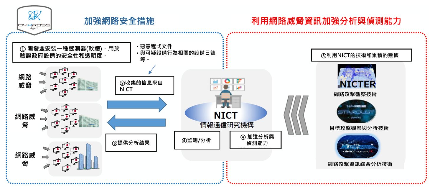 此外,將透過日本國立資訊通信技術研究所(NICT)自主研發的檢測軟體(CYXROSS Sensor)引入政府機構終端,並建立一套日本特有的原始資訊收集與分析系統,加強對政府機構及其他組織遭受網路攻擊的監控。