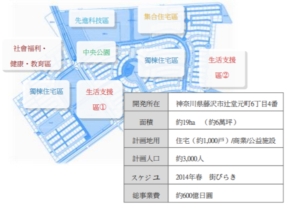 藤澤市位於日本神奈川縣中部,神奈川縣政府改造松下(Panasonic)公司運用其所有原電視工廠舊址變更為住宅區的造鎮計畫,面積約19公頃,總興建戶數1,000戶,其中獨棟住宅約600戶,集合住宅約400戶,計畫人口約3,000人(圖1)。該社區集結最新能源科技,打造實現永續智慧生活的未來社區。
