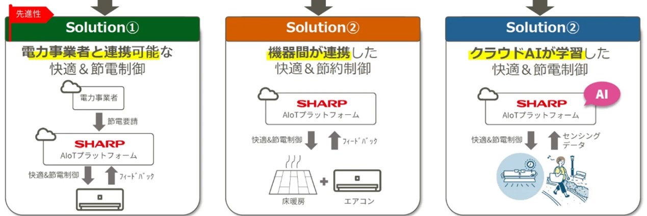 (3) 雲端 AI 最佳化學習控制:SHARP AIoT平台收集用戶的感測數據(如居住狀況、室內溫濕度等),經由雲端AI學習與分析,發送最佳化控制指令給家電設備。透過感測數據分析,實現動態節能優化。